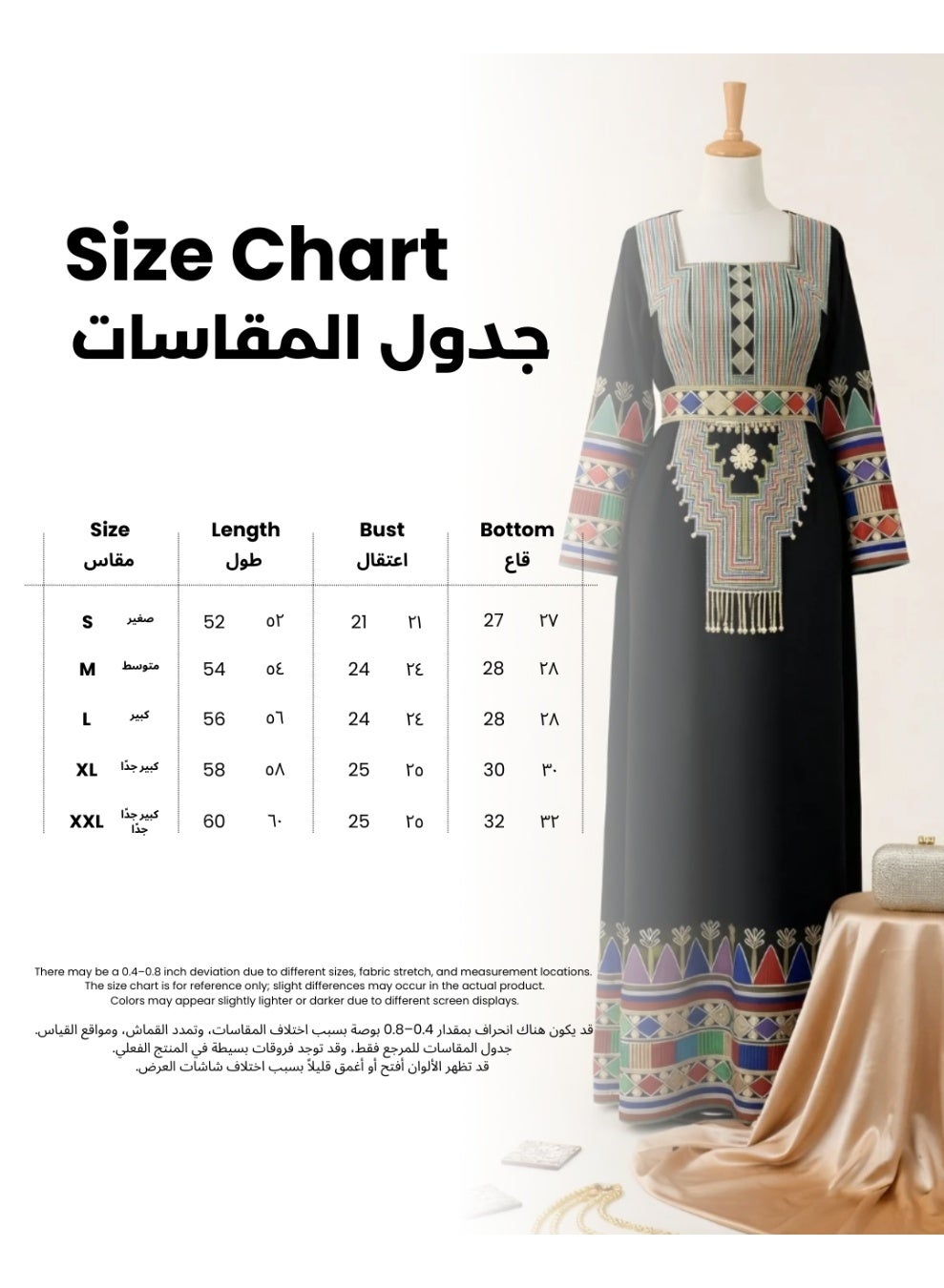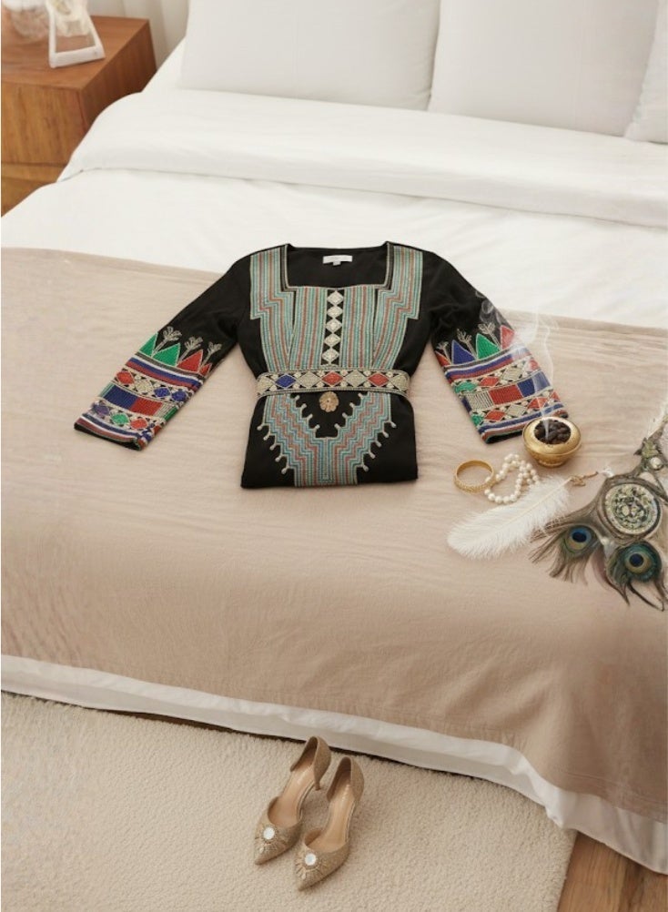 صُمم فستان الجلابية الطويل المطرز من عسيري تاتريز كتجسيد فاخر للتطريز الفلسطيني التقليدي. لطالما استخدمت تاتريز أنماط الغرز المتقاطعة النابضة بالحياة للتعبير عن هوية القرية وقصصها الثقافية، ويعيد هذا الفستان ابتكار تلك الزخارف في لوحات هندسية ملونة على طول الفستان. يحيط التطريز الغني بخط العنق والخصر والحافة، جاذبًا النظر عموديًا لإضفاء طول إضافي. يمنح القماش الفاخر والتصميم الدقيق الفستان انسيابية أنيقة، مما يجعله مناسبًا لحفلات الزفاف، واحتفالات العيد، والمناسبات الثقافية الرسمية. تساعد البطانة المريحة على ملامسة التطريز للبشرة بسلاسة، بينما يحافظ الخصر المحدد أو التنورة ذات القصة المستقيمة على ملاءمة الفستان لمختلف أشكال الجسم. نسقيه مع إكسسوارات بسيطة لإبراز الألوان والأنماط، أو أضيفي حزامًا مميزًا لمزيد من الأناقة. هذا الفستان مثالي لكل من تبحث عن فستان مميز ذي طابع تراثي، يظهر جماله في الصور ويمنحها إطلالة رائعة في كل مرة ترتديه. فستان عسيري ماكسي فاخر مطرز من تاتريز بنقوش هندسية ملونة للمناسبات الخاصة للنساء. اجعلي كل مناسبة لا تُنسى مع فستان ماكسي من تاتريز مطرز بشكل فاخر يتميز بألوانه وحرفيته العالية. يعشق العملاء التطريز الهندسي النابض بالحياة، والملمس الفاخر، والجمالية التقليدية الراقية.